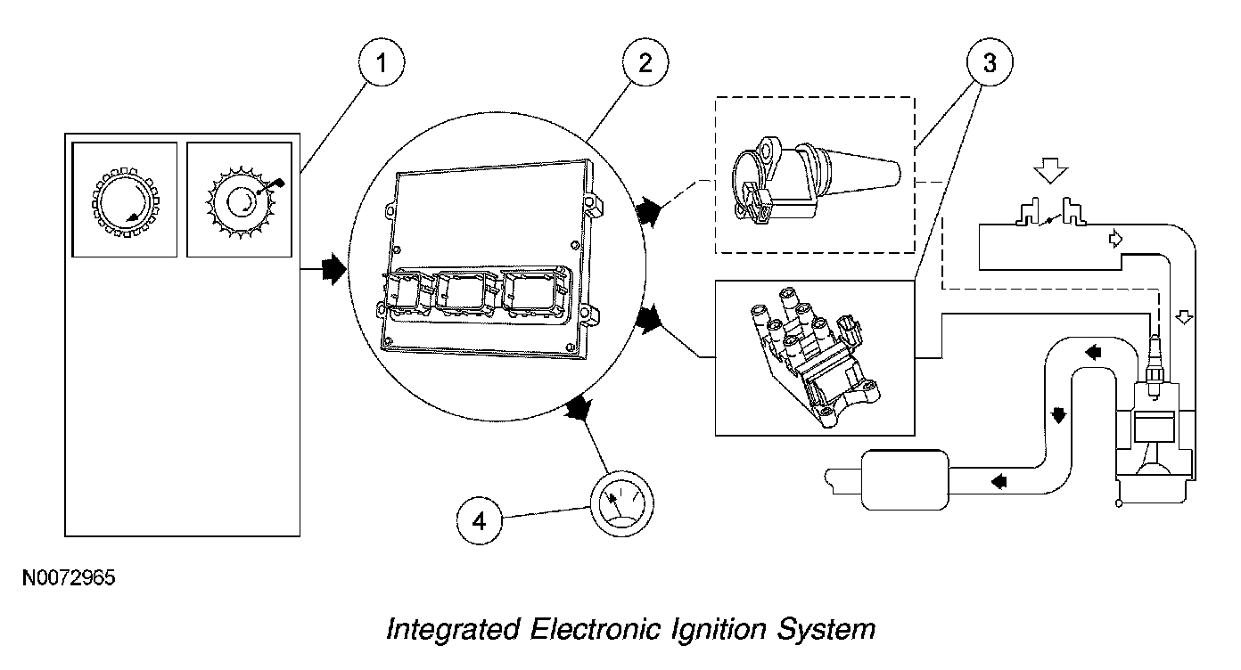 During engine crank the PCM fires 2 spark plugs simultaneously. Of the 2 spark plugs fired, one is under compression while the other is on the exhaust stroke. Both spark plugs fire until camshaft position is identified by a successful CMP sensor signal. Once camshaft position is identified only the cylinder under compression is fired.