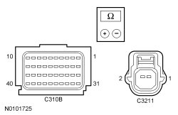 - Measure the resistance between RCM (Restraints Control Module) C310B, harness side and passenger side impact sensor C3211, harness side using the following chart.