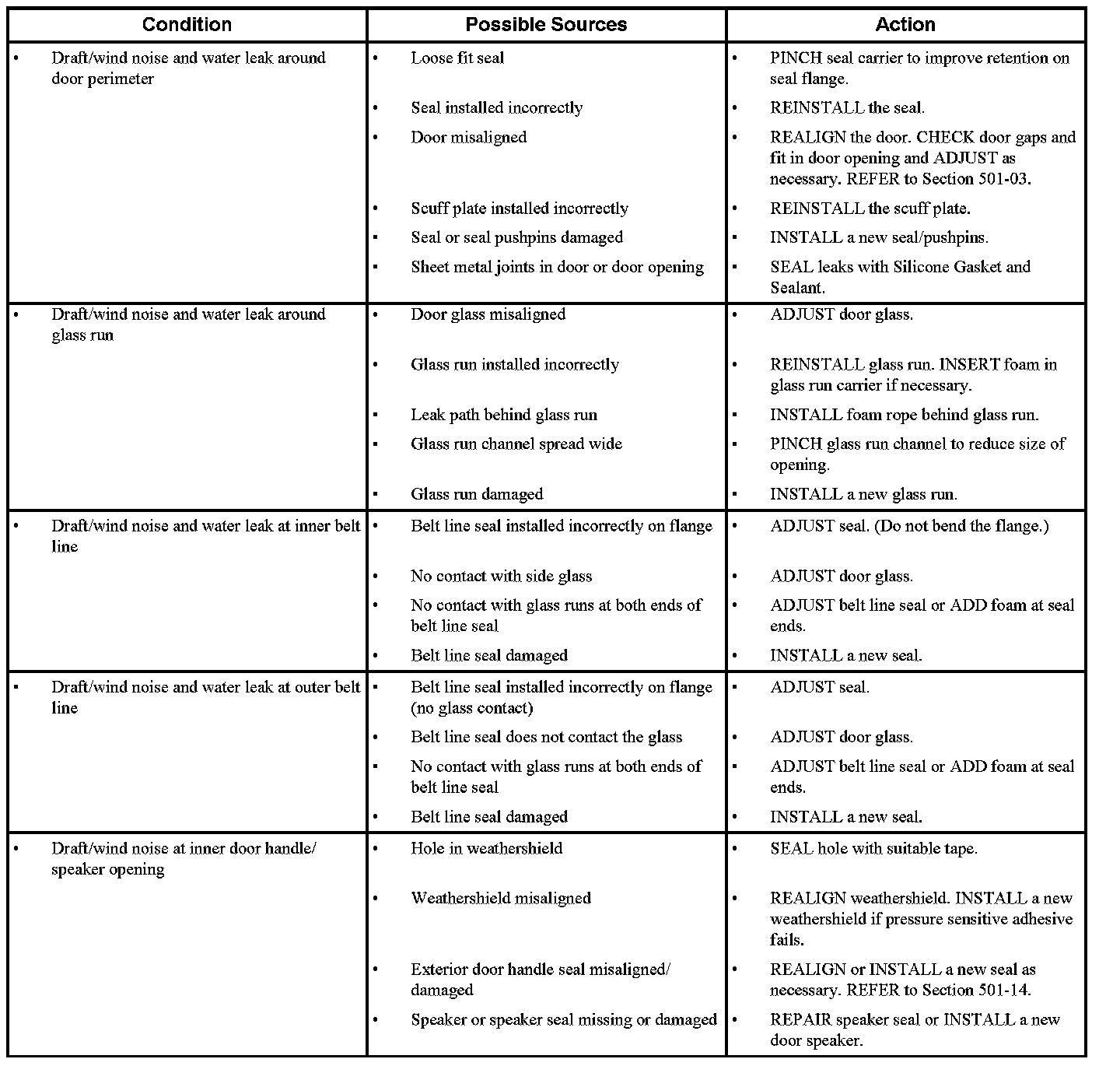 Most dust and water leaks occur due to missing or mis-installed body sealer or components. The source of the leak is detected by: