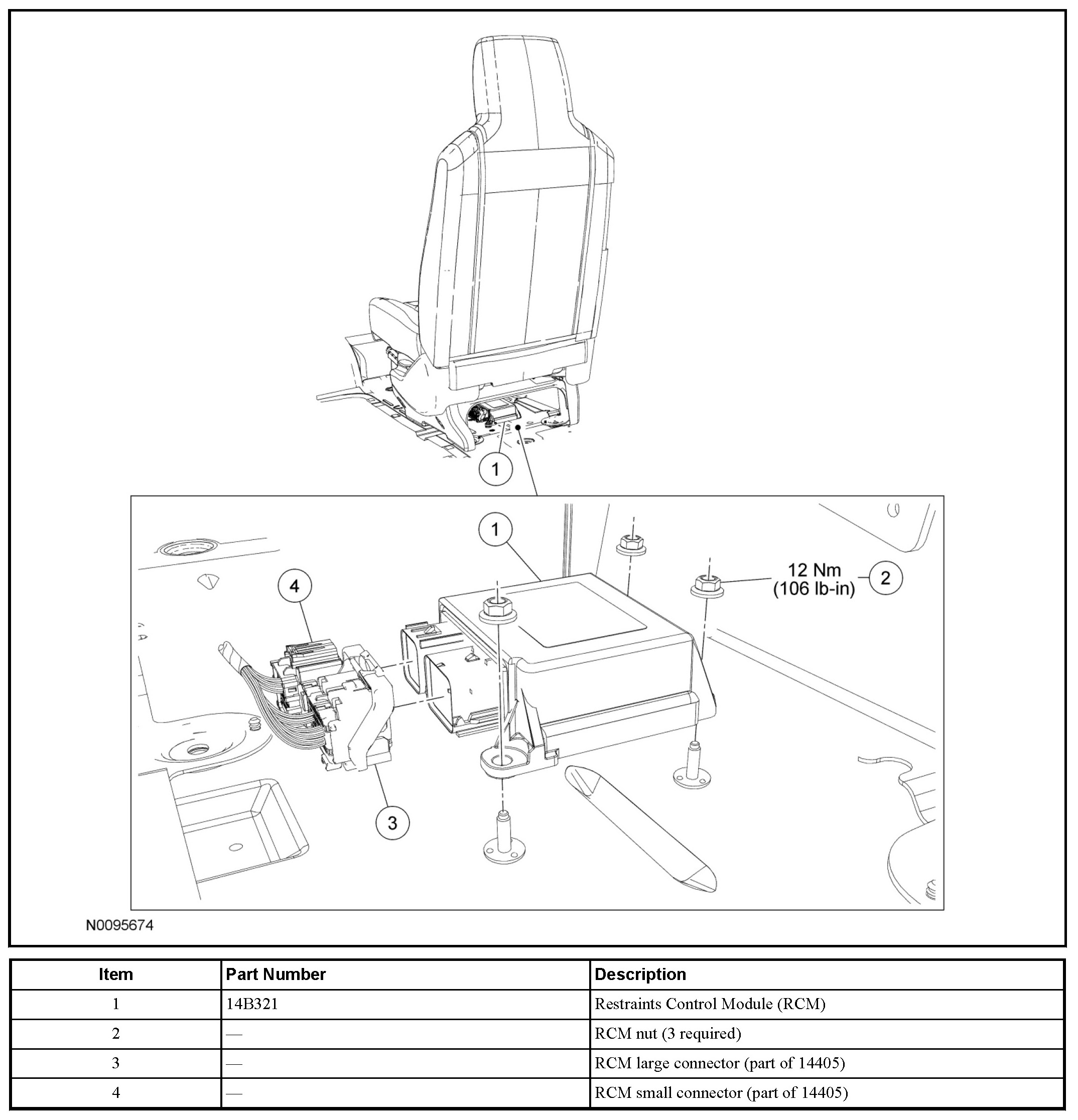 1. WARNING: Always tighten the fasteners of the restraints control module (RCM) and impact sensor (if equipped) to the specified torque. Failure to do so may result in incorrect restraint system operation, which increases the risk of personal injury or death in a crash.