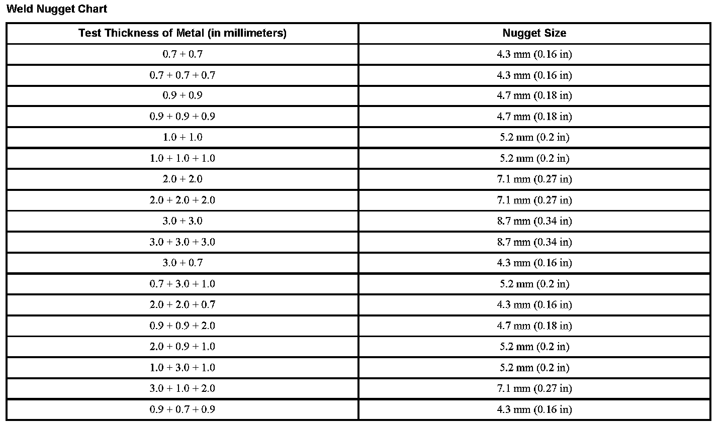 Weld Nugget Chart