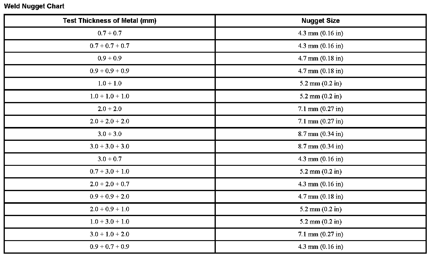 Weld Nugget Chart