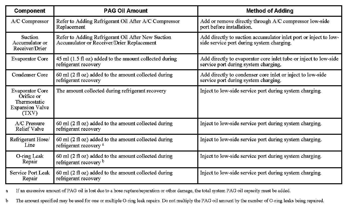 NOTE: During normal A/C operation, oil is circulated through the system with the refrigerant, and a small amount is retained in each component. If certain components of the system are removed, some of the PAG oil will go with the component. To maintain the original total oil charge, it is necessary to compensate for the oil lost by adding oil to the system with the new part.
