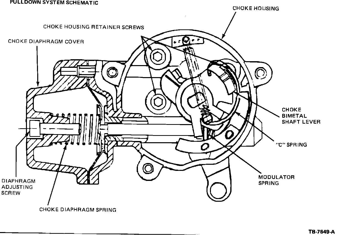 b. Apply 17 in. Hg vacuum to the vacuum tube on the choke diaphragm cover. Apply a very light counterclockwise closing force to the choke bimetal shaft lever.