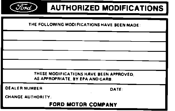 Obtain an Authorized Modifications decal and list the date, dealer number and summary of alterations performed. Select a prominent place adjacent to the Vehicle Emission Control Information decal suitable for installing the Authorized Modifications decal. Clean the area, install the decal and cover it with a clear plastic decal shield.