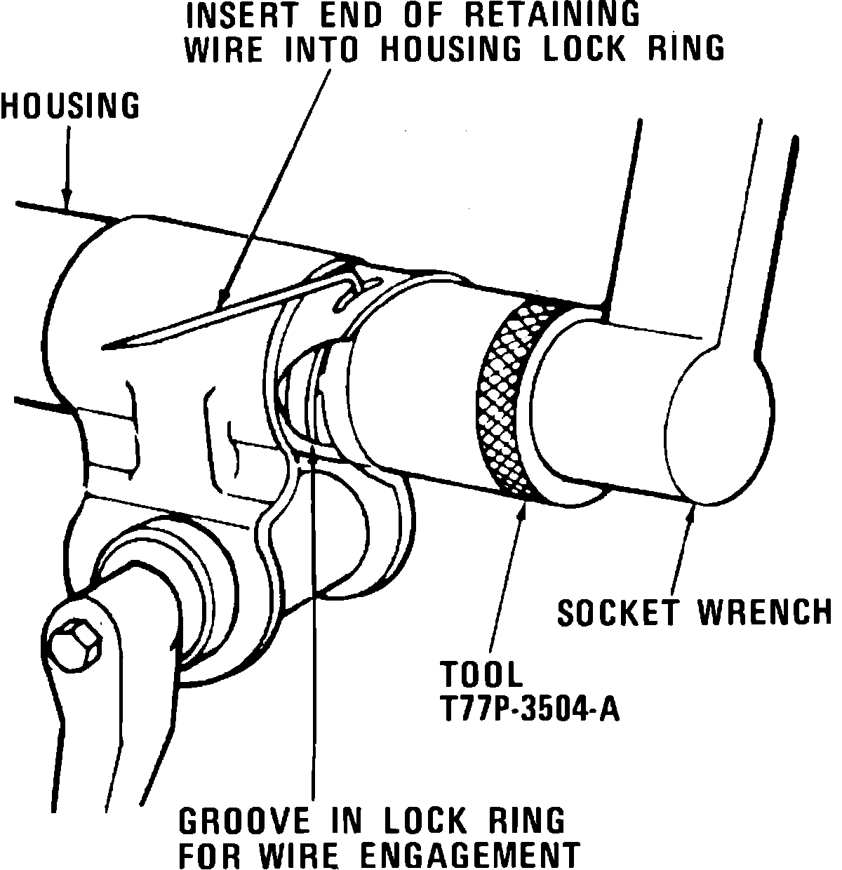 10. Using lock ring wrench tool No. T77P-3504-A, or equivalent, with drive tabs engaged in the end plate slots, push in end plate until end plate retainer wire groove is visible through the rack cylinder slot. Rotate end plate to line up the retainer wire hole with the cylinder slot, insert bent end of the retainer wire in the wire hole and rotate end plate clockwise until the retainer wire is fully engaged. Turn an additional 180 degrees, Fig. 22.