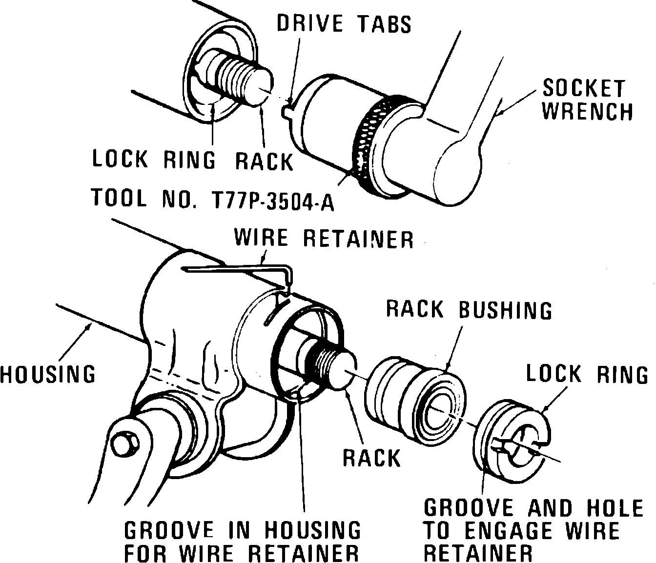 2. Working from the right side of gear, push in rack until it bottoms. Position rack bushing lock ring tool No. T77P-3504-A, or equivalent, over exposed end of rack and engage socket drive tabs in end plate slots, rotate tool clockwise until the end of the retainer wire is visible in the tube slot, turn tool counterclockwise and using an icepick or similar tool, start the retainer wire out of the slot and remove, Fig. 13.
