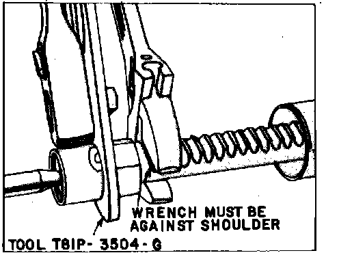 5. The following tools must be used to remove the socket, tool No. T81P-3504-G, or equivalent, a torque wrench and a crescent wrench to hold the rack from rotating, Fig. 29.