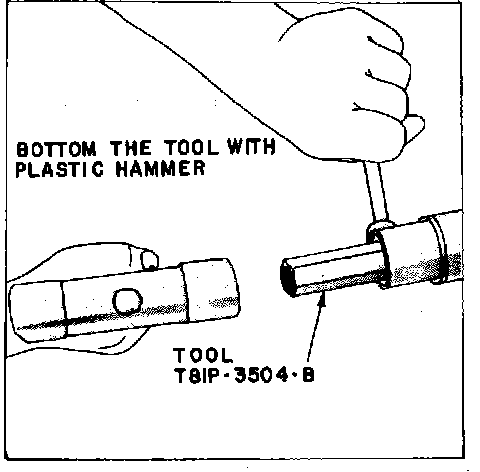b. Place valve sleeve ring over tool, quickly push down on pusher tool No. T81P-3504-M2, or equivalent, sliding the ring down into the fourth groove, Fig. 37B.