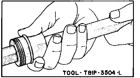 1. Using rack oil seal replacer tool No. T81P-3504-C, or equivalent, apply power steering fluid to inner rack seal and position seal on tool, seal lip facing tool, Fig. 44. Insert sizing tool T81P-3504-K, or equivalent, in end of rack tube, position seal replacer in sizing tool and carefully push in by hand until bottomed, tap the tool with a plastic hammer to seat the seal, leaving sizing tool installed in rack.