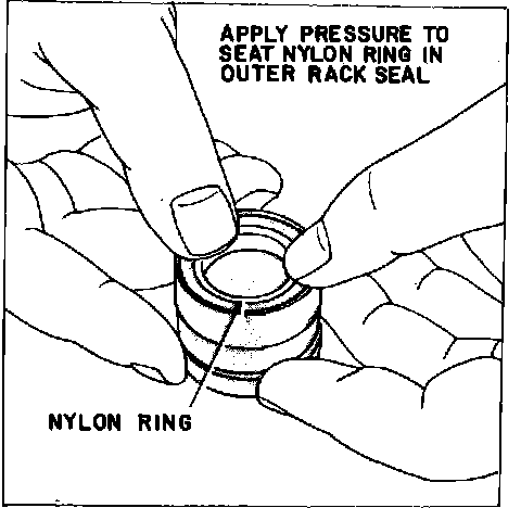 6. Apply gear lube to outer rack oil seal, install oil seal in rack bushing with outer rack oil seal replacer, Fig. 47. Lip spring must face the inside of the bushing, Fig. 48. Install nylon ring in oil seal, Fig. 49.
