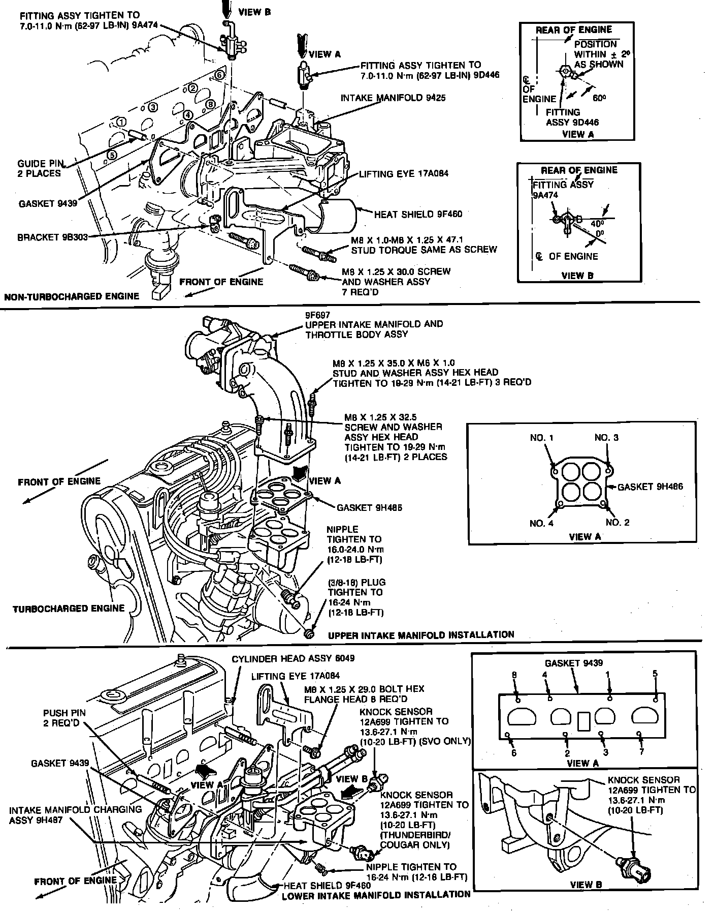 13. Reverse procedure to install. Torque intake manifold bolts in sequence shown in Fig. 5. Torque bolts in two steps first to 11---12.5 ft. lbs., then to 14---21 ft. lbs.