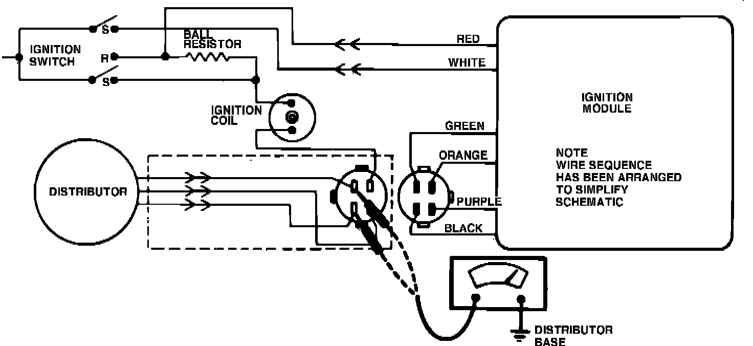 2. Using a suitable ohmmeter, connect one lead to ground at distributor base. Using other lead, alternately measure resistance of harness wiring which connects to orange and purple wires of module connector and ground, see Fig. 1.