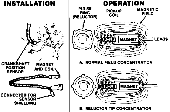 CRANKSHAFT POSITION SENSOR (CP) - Permanent magnet with coil. Sensor produces AC pulse when magnetic pulse sensor is disrupted by a gear tooth or notch. Senses pulse ring lobes. Resultant signal enables ECA to determine when the ignition module should be triggered to produce a spark. Also, provides RPM information which is used to calculate spark advance, EGR flow and air/fuel ratio (replaces distributor centrifugal advance weights and timing pickup). One pulse is produced for each cylinder every other engine rotation (one for each spark plug firing). Example: 4 pulses are produced for each V8 engine rotation. The CP pulse is generated at 10 Before Top Dead Center (BTDC).