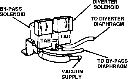 THERMACTOR AM DIVERTER SOLENOID (TAD) - Electrical solenoid or its control line. Solenoid switches engine manifold vacuum. Vacuum switches thermactor air from downstream (past EGO sensor in exhaust system) to upstream (before EGO sensor) when solenoid is energized.