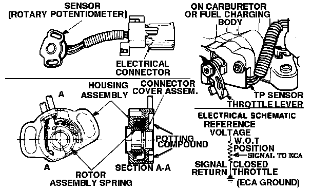 THROTTLE POSTION SENSOR (TP). Potentimetric sensor or its signal line. Sensor wiper position is proportional to throttle position.