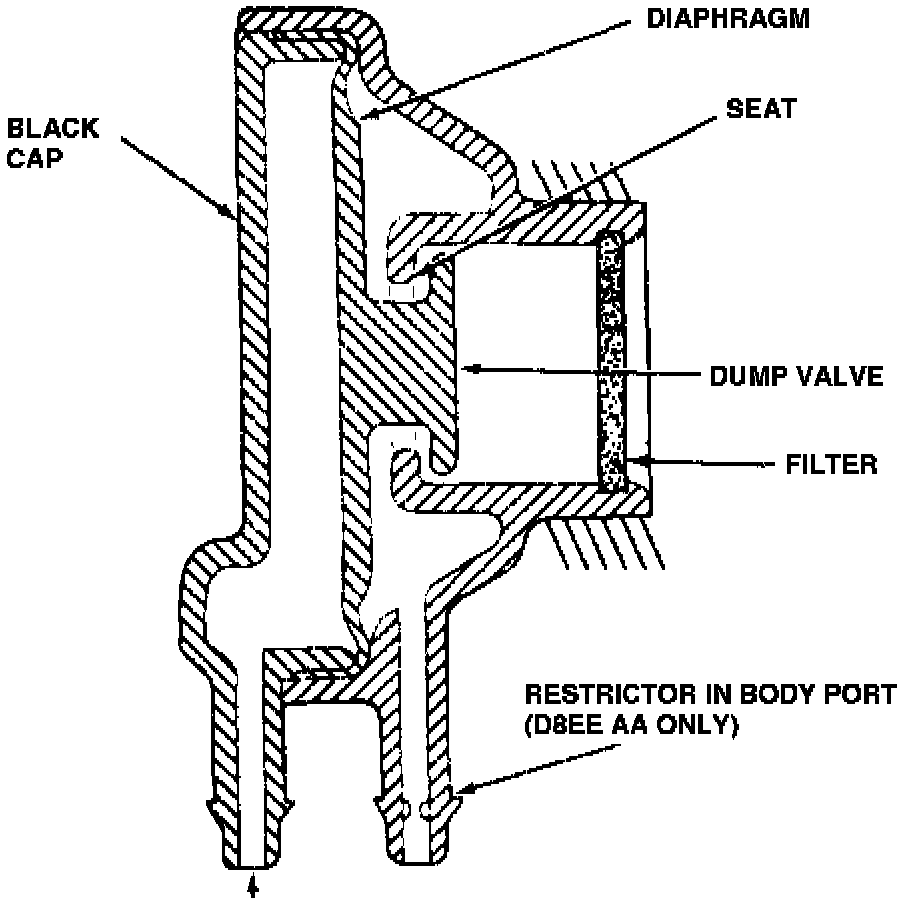 Vacuum vent valves, Figs. 31 and 32, control the induction of fresh air into a vacuum system to prevent chemical decay of vacuum diaphragms that can occur on contact with fuel vapors. Two types of valves are used. The black color coded valve is a vent valve only, while the natural color coded valve is a combination vent and delay valve.