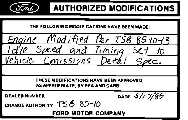 Obtain an Authorized Modifications decal and list the date, dealer number and summary of alterations performed. Select a prominent place adjacent to the Vehicle Emission Control Information decal suitable for installing the Authorized Modifications decal. Clean the area, install the decal and cover it with a clear plastic decal shield.