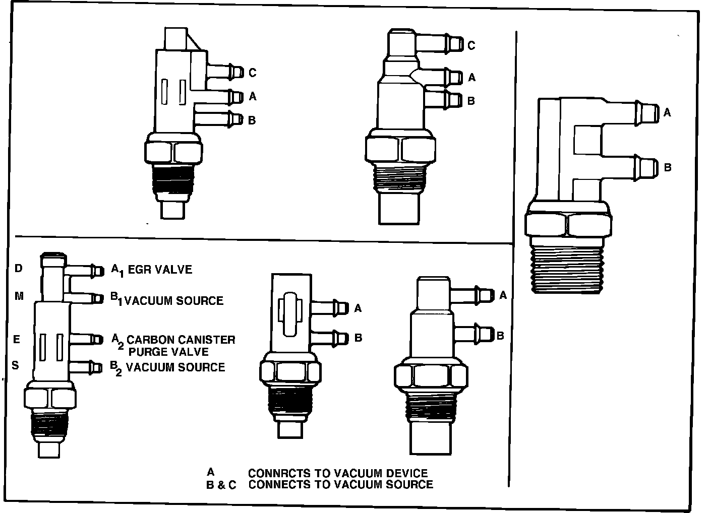 2. Apply and maintain 16 inches Hg vacuum to port A, then apply vacuum to port B. If air does not flow, replace valve. Never apply vacuum to port(s) C.