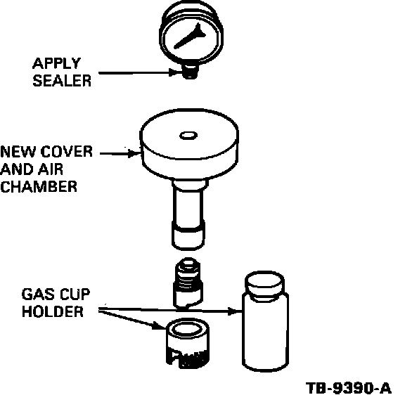 5. Using thread sealer or teflon tape on the threads of the PSI gauge, install gauge and tighten into new cover and air chamber, Figure