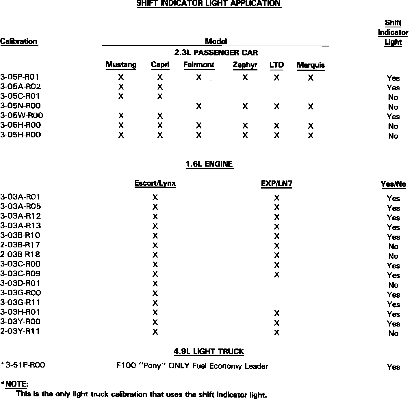 The chart updates the list originally published in TSB Article 82-25-16 (Figure 8), and lists all current manual transmission engine calibrations and shows which vehicles are supposed to have functioning light and which do not. This chart will be updated periodically throughout the year. Also, future editions of the Owners Guides will be revised to say that "Some manual transmission vehicles will be equipped with a shift indicator light, depending on engine calibration."