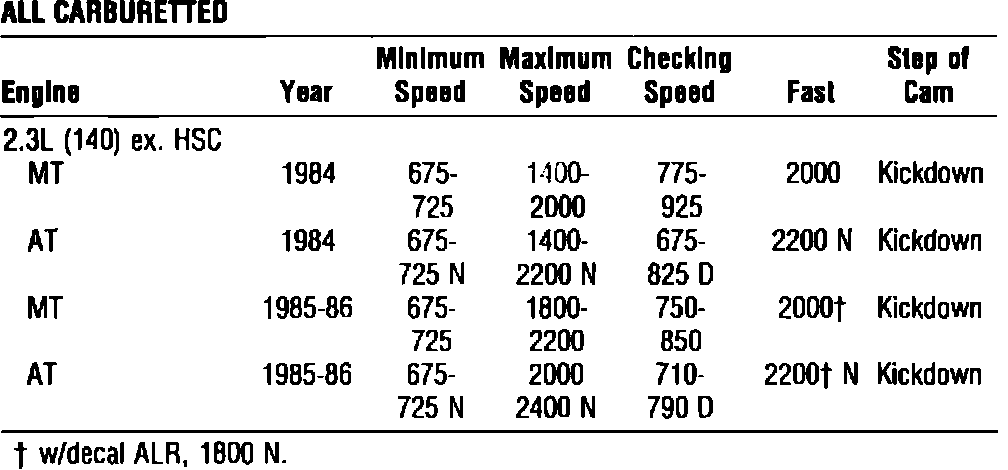 Carburetted Model, Idle Speed Specifications: