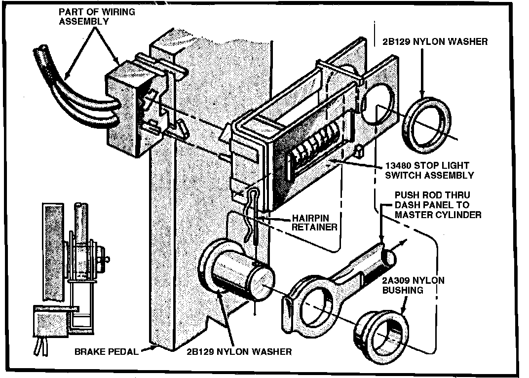 2. Remove hairpin retainer and slide stop light switch, pushrod, nylon washers and bushings away from brake pedal, and remove switch, Fig. 4.