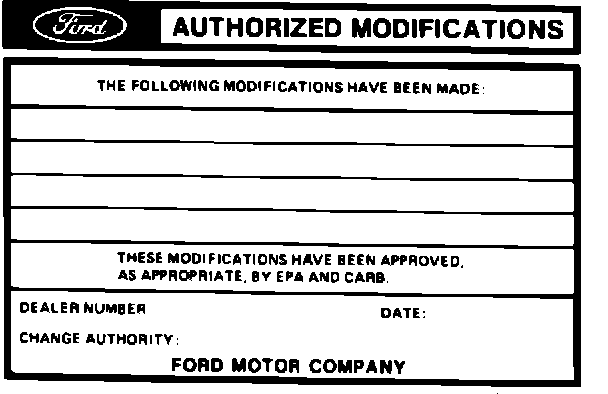 Obtain an Authorized Modifications decal and list the date, dealer number and summary of alterations performed. Select a prominent place adjacent to the Vehicle Emission Control Information decal. Clean the area, install the decal and cover it with a clear plastic decal shield.