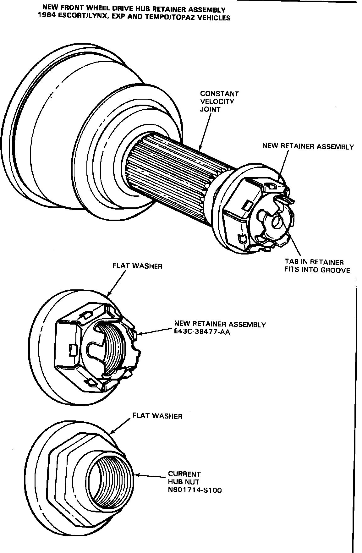 A new retainer assembly designed to improve installation and bearing life was installed in production on some of the subject vehicles as of late November, 1983. The new hub retainer assembly is a special laminated spring design with a self-locking and ratcheting mechanism (Figure 3). This feature eliminates the necessity of staking the hub nut into the slotted groove in the constant velocity outer shaft. The new retainer is interchangeable with the current style hub nut on all Escort/Lynx, EXP and Tempo/Topaz vehicles.