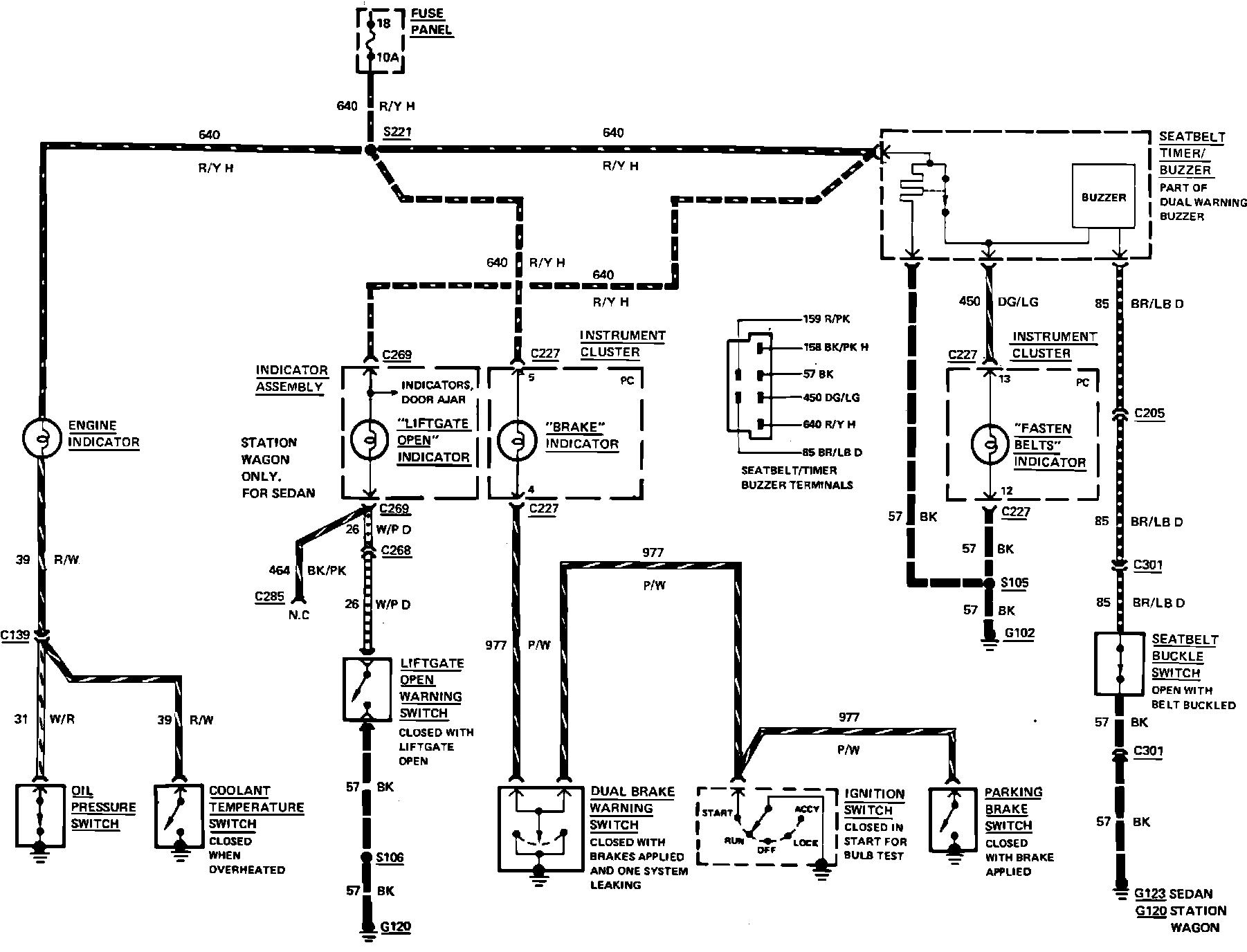 Fig. 9 Brake, Liftgate Open & Seatbelt Warning Indicators Wiring Circuit. 1985: