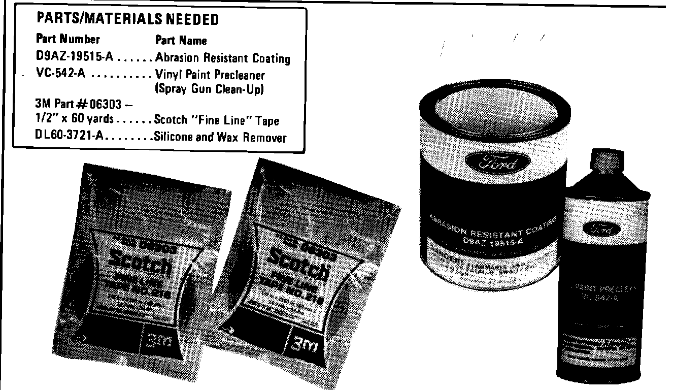The abrasion resistant coating is available in one quart cans from Ford and Lincoln-Mercury dealers. Approximately two quarts will be required for an initial installation on a passenger car similar to a factory-applied system and slightly more for an Econoline. The specified dry film thickness of 15 to 20 mils (.015 to .020") will require at least three or possibly four applications of coating material, with flash off time allowed between coats. As with painting, spray coat the complete lower panel. The adherence of this coating to properly prepared sheet metal is excellent and it is not necessary to prime the repaired sheet metal. However, adhesion will be adversely affected unless the sheet metal (either repaired or new) is prepared in accordance with the following procedure: