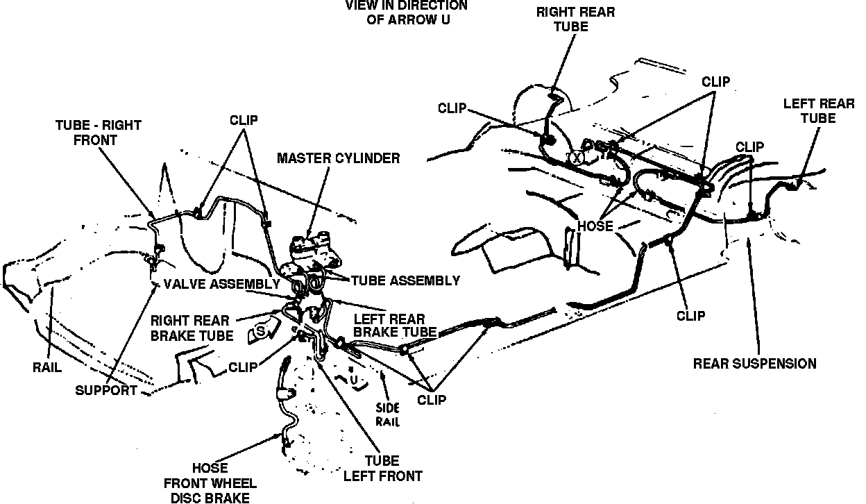 The hydraulic brake lines on this system, however, have been diagonally split front to rear (left front to right rear and right front to left rear) in place of separate lines to the front and rear wheels, Fig. 3.