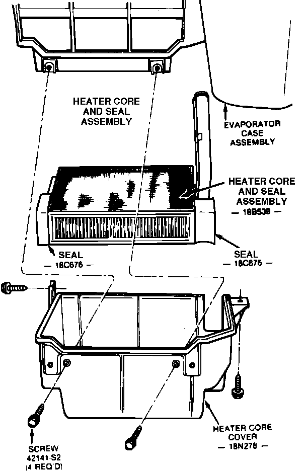 4. Remove screws attaching heater core cover to the Evaporator Case, then remove the heater core and cover from the plenum, Fig. 12.