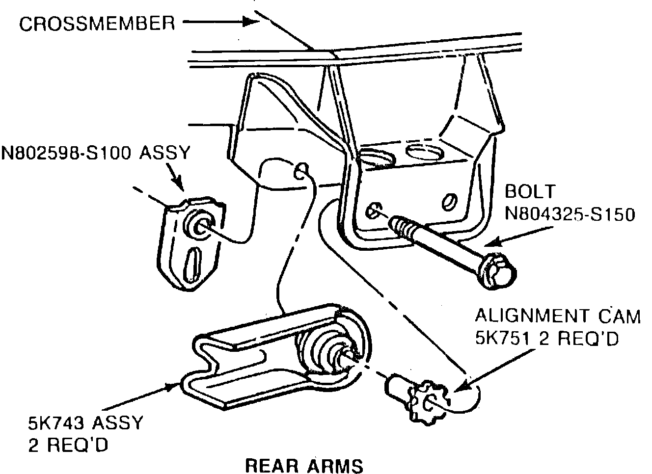 Toe-in and toe-out can be adjusted when it is determined that the vehicle is not within alignment specifications. To adjust toe of either wheel, loosen bolt attaching rear control arm to body and rotate alignment cam until the required alignment setting is obtained. Tighten control arm attaching bolt to 40-55 ft lb.