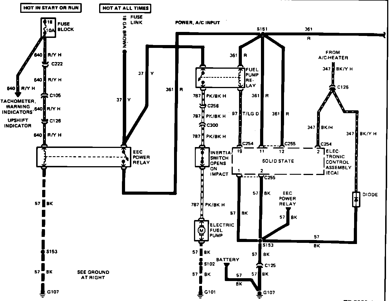 h. Energize the fuel pump (ground the ground lead from the relay) for 10 seconds. Observe pressure while energized. If there is no pressure, monitor the voltage past the inertia switch to determine whether the pump is gening the proper voltage. Correct any faults as necessary.