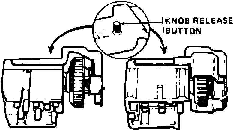 2. Remove control knob and shaft assembly, by placing knob in full ``On'' position, then pressing knob release button on switch and pulling out knob and shaft, Fig. 2. To gain access to the release button on Fairmont and Zephyr models with air conditioning it may be necessary to first disconnect the left A/C duct.