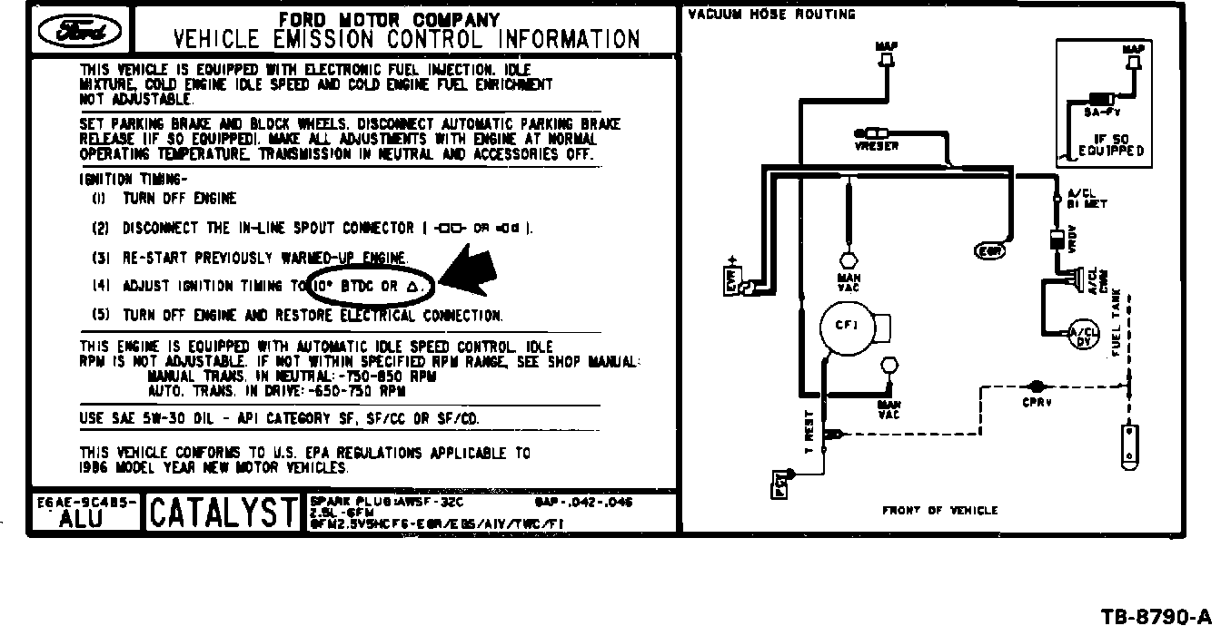 The vehicle emission control information decal Step 4 says to "adjust ignition timing to 10~ BTDC or the symbol "triangle", Figure 6". Field technicians are not sure as to which of the three symbol "triangles" is 10~ BTDC on the automatic transaxle flex plate. This is because the wrong symbol is used on the decal. The correct symbol should be a "V" not a symbol "triangle". To set the timing to 10~ BTDC, set the timing mark to the deep "V" (10~ BTDC) found on the automatic transaxle flex plate.
