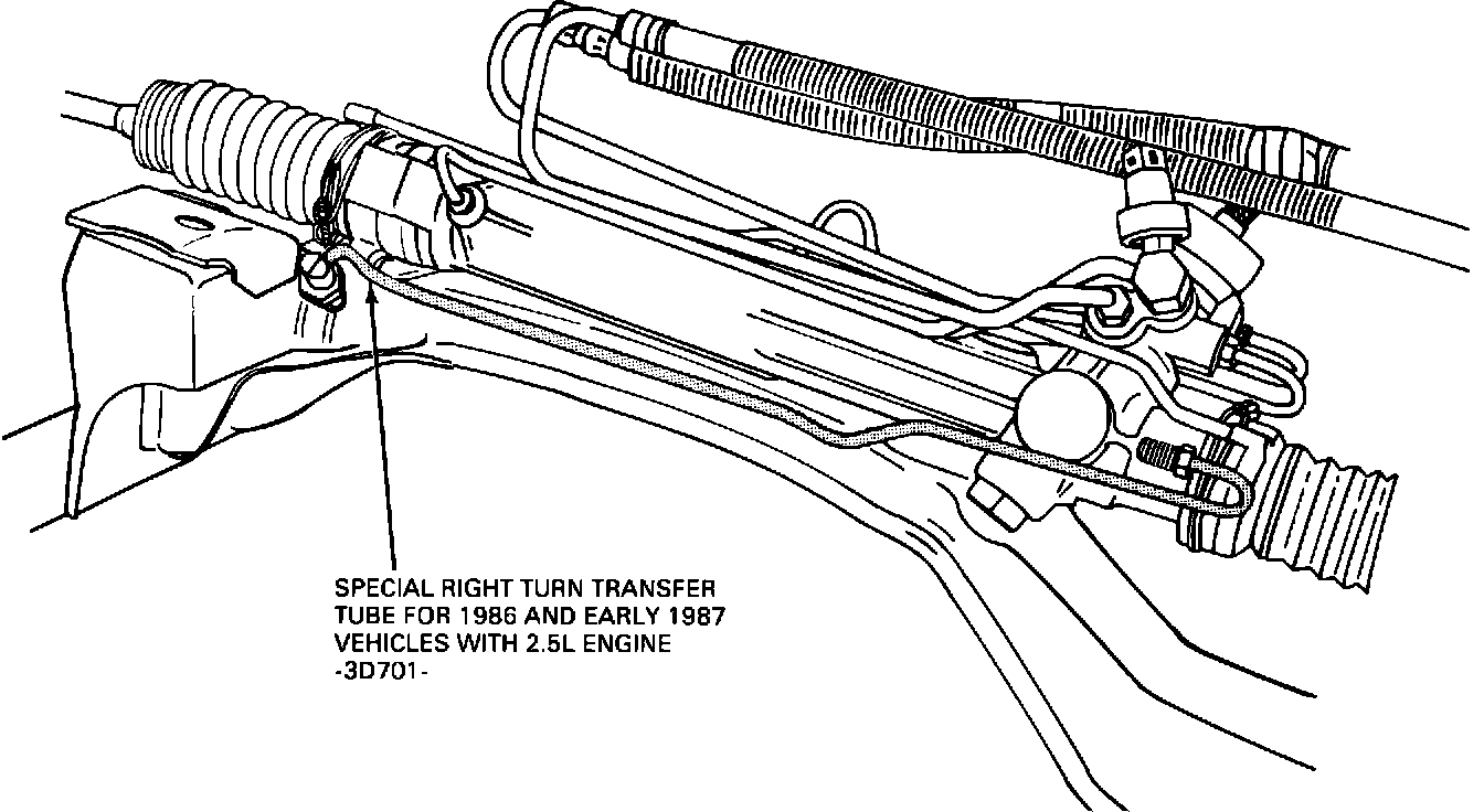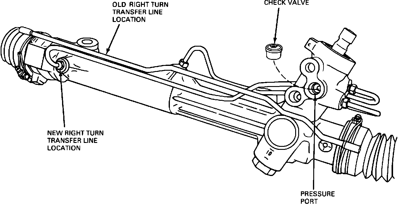 ISSUE: A new design power steering gear is used on vehicles built after January 30, 1987. The steering gear check valve is relocated to the inside of the pressure port where the power steering pressure line attaches on these new gears. Also, a new heat shield is used on vehicles with 2.5L engines. The new design steering gear may be used to service vehicles built before January 30, 1987. However, if the new gear is used, the new heat shield needs to be installed on 2.5L engine applications.