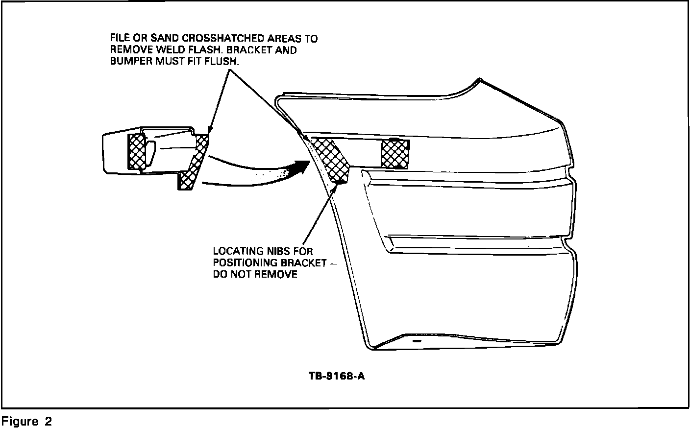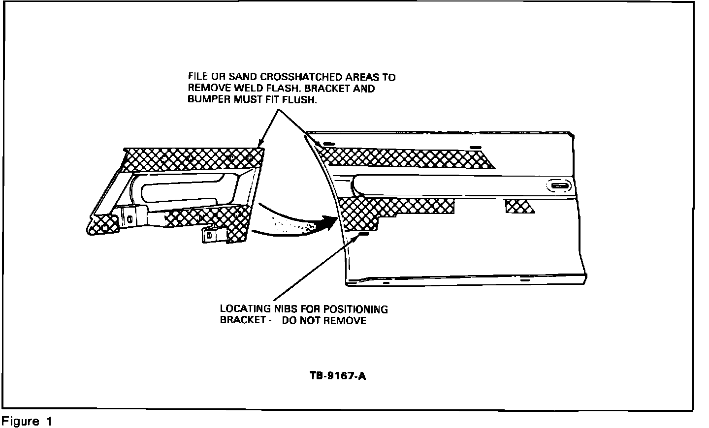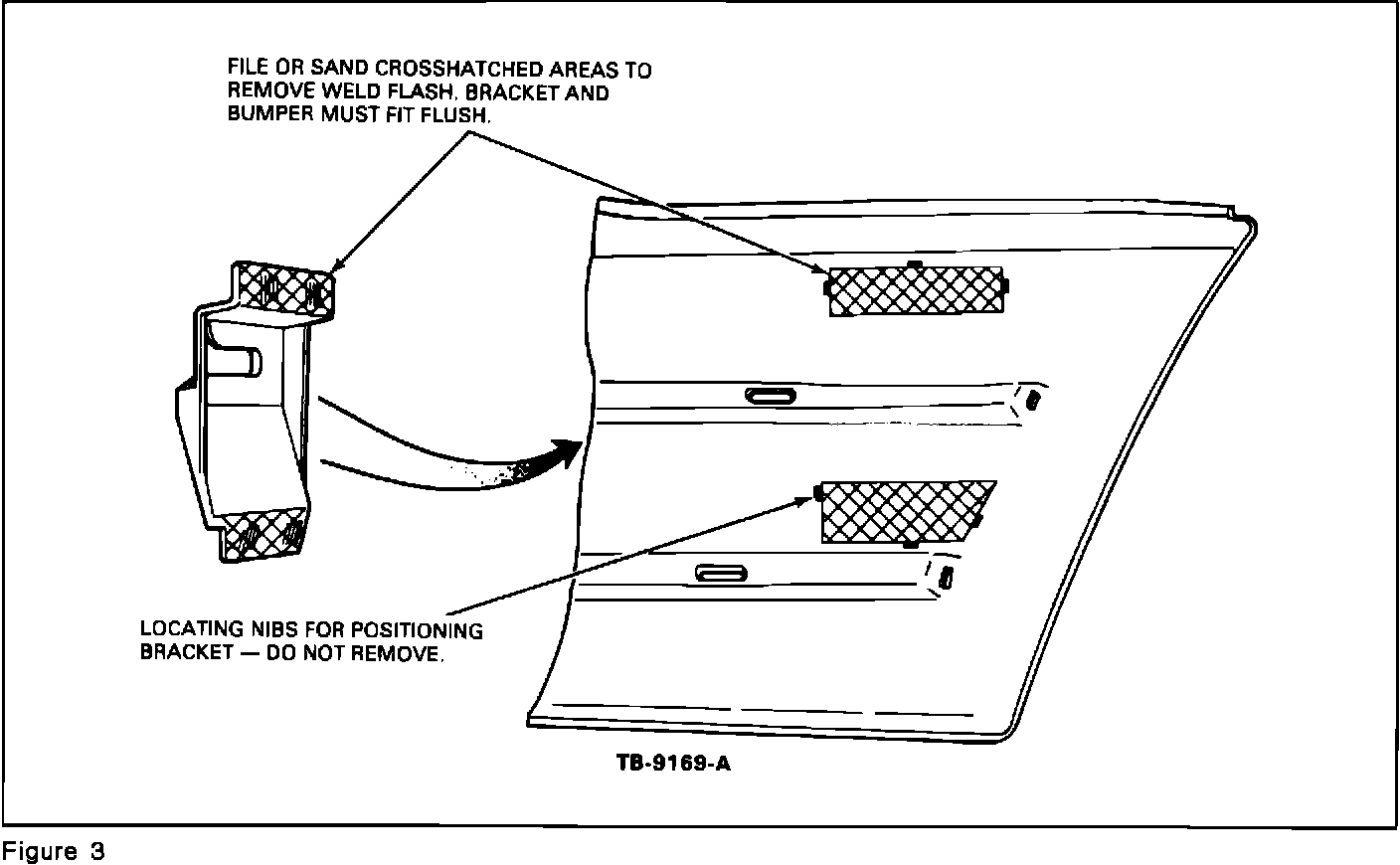 4. File or sand bracket and bumper mating surfaces to remove weld flash so bracket fits flush to bumper, figures 1, 2 and 3.