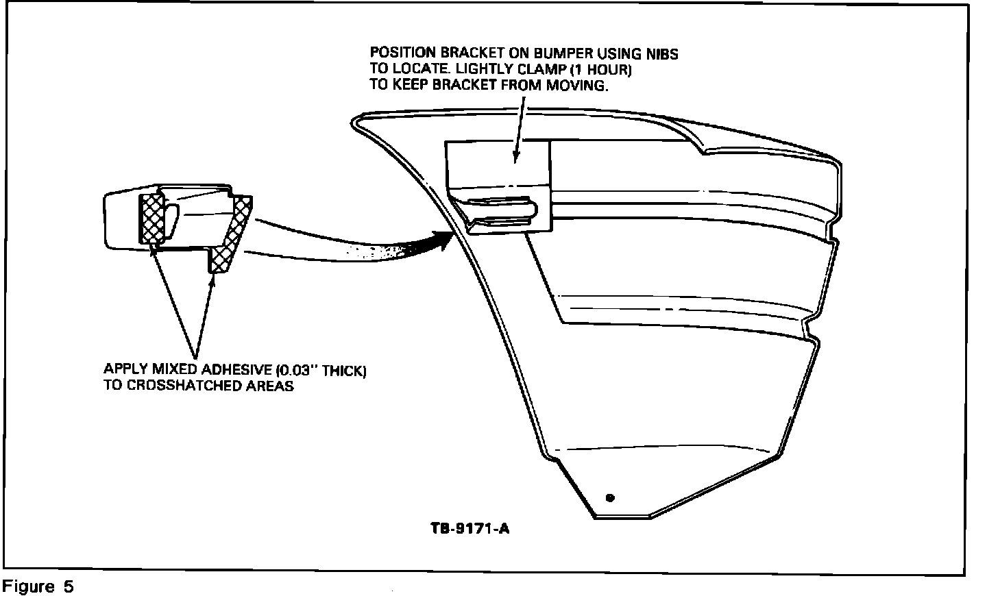 8. Apply mixed adhesive to the mounting bracket flange and install to bumper, Figures 4, 5 and 6.