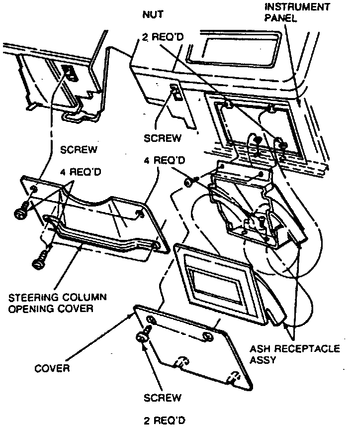 12. Using steering column, cluster and glove compartment openings, reaching under instrument cluster, disconnect all electrical connections, vacuum hoses, heater-A/C control cables and radio antenna.