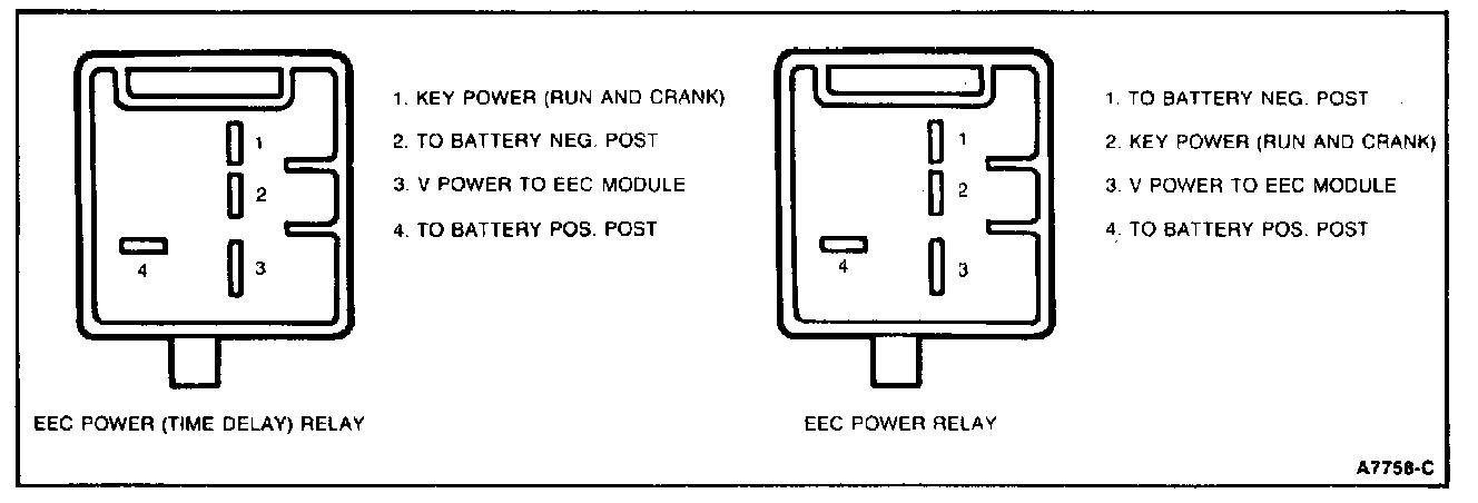 EEC power relays are in parallel with the ignition switch and provide power to the EEC module. Power relays also provide reverse battery protection and increased load handling to improve ignition switch reliability.