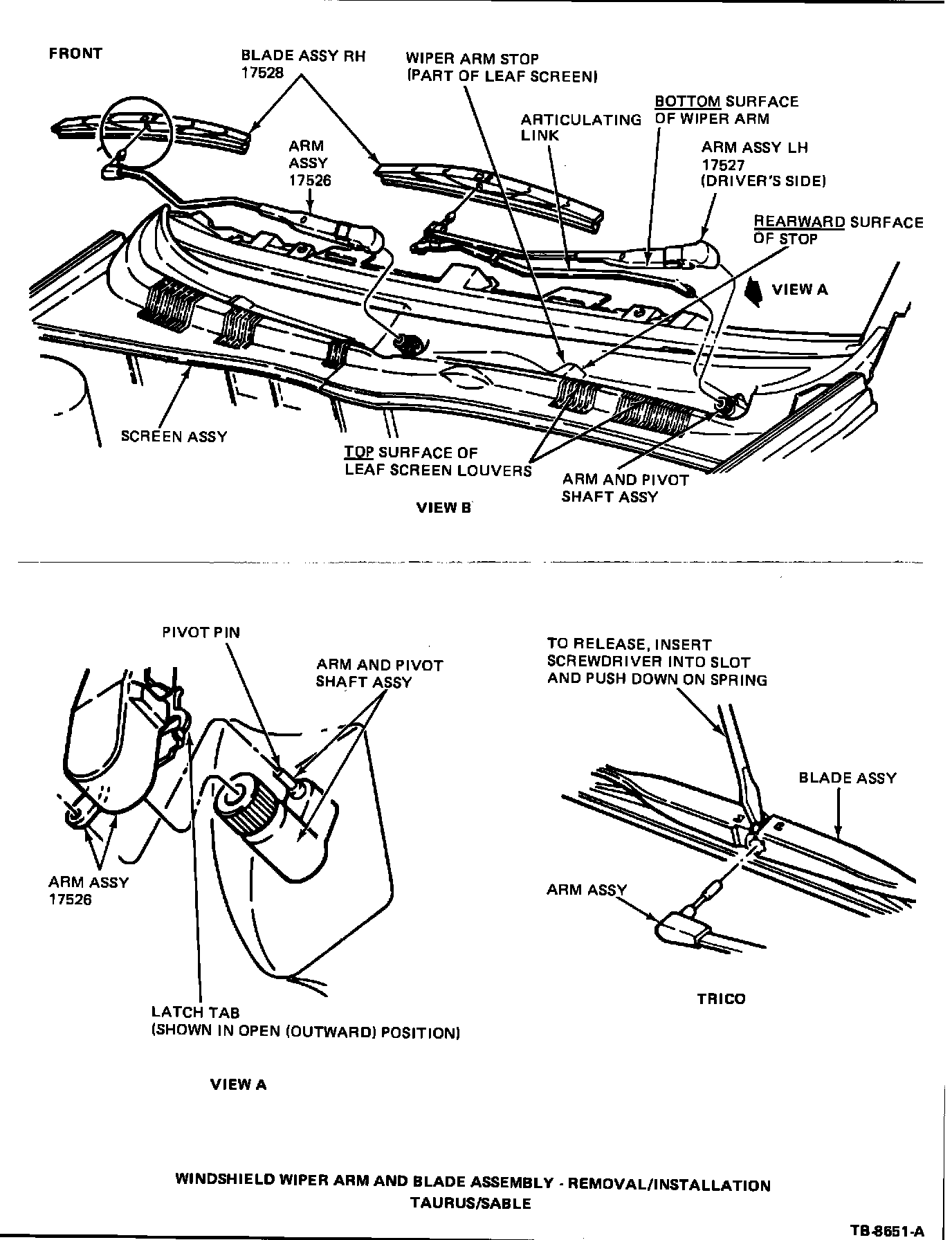 4. To remove the blade assembly, insert a screwdriver into the slot provided at the top of the blade frame (as shown in View B), push down on spring lock and pull the blade assembly from the wiper arm pin.