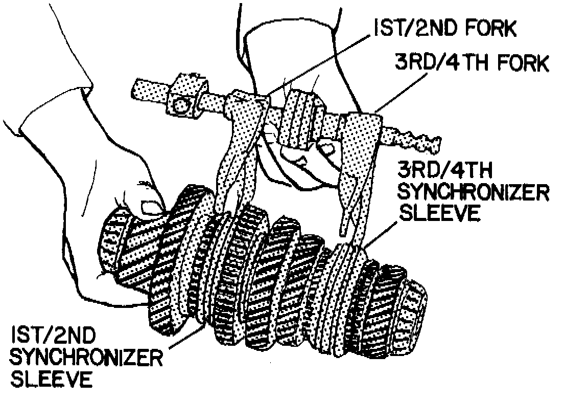 3. Position mainshaft control assembly so shift forks engage their respective slots in synchronizer sleeves on main shaft assembly.