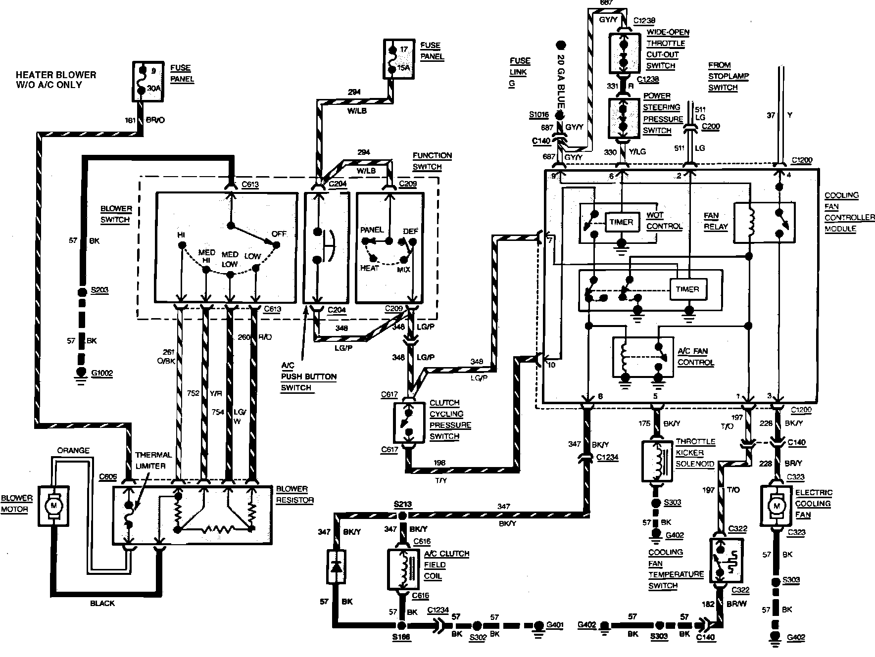 Fig. 3 Air Conditioning, Heater & Engine Cooling Fan Wiring Circuit. Tempo & Topaz W/Gasoline Engine: