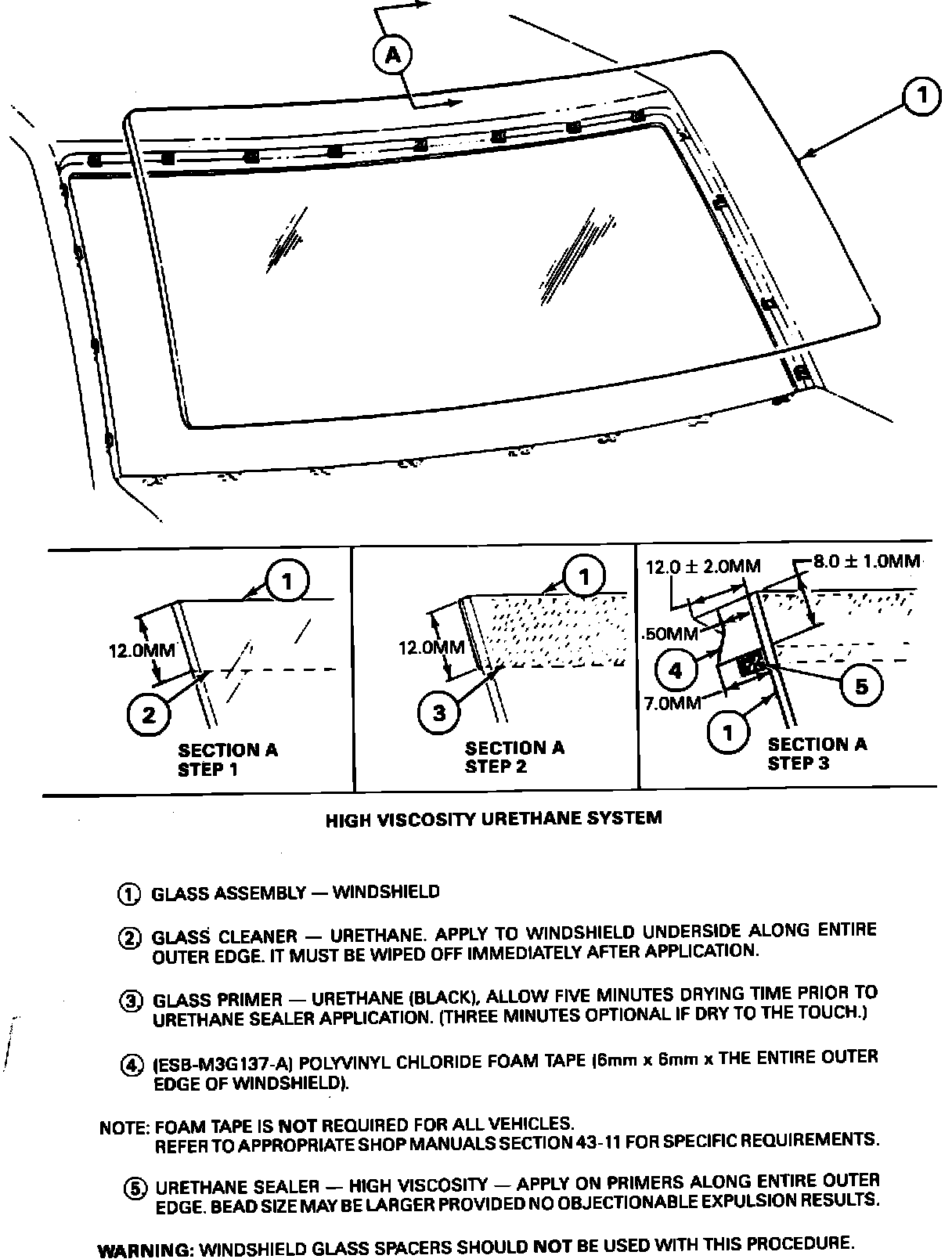 NOTE: FOAM TAPE IS NOT REQUIRED FOR ALL VEHICLES. REFER TO THE APPROPRIATE SHOP MANUALS, SECTION 43-11 FOR SPECIFIC REQUIREMENTS.