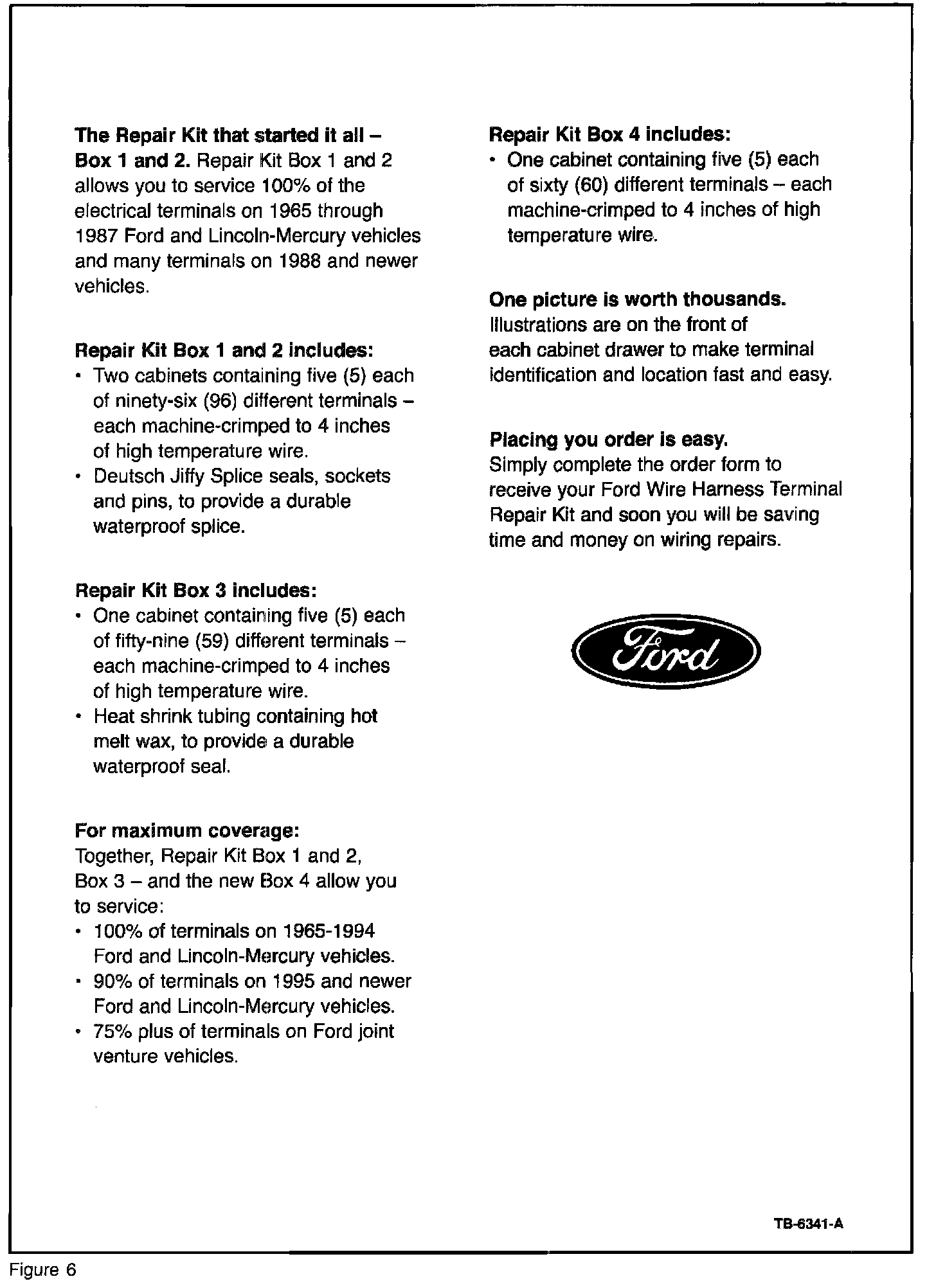 Dual Wall Heat Shrink Tubing containing hot melt wax is included with Repair Kit Box # 3 and offers a Ford-approved method for joining two (2) circuits. When properly used with a soldered circuit joint, this Ford-approved heat shrink tubing will provide a stable, low electrical resistance connection for years of service in any Ford or Lincoln-Mercury vehicle.