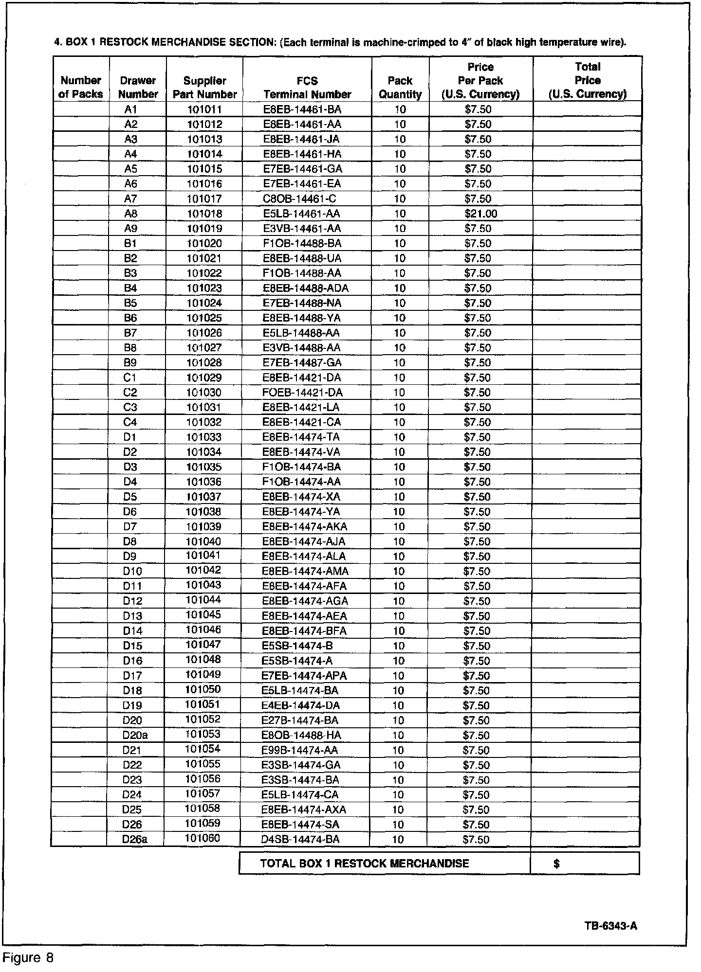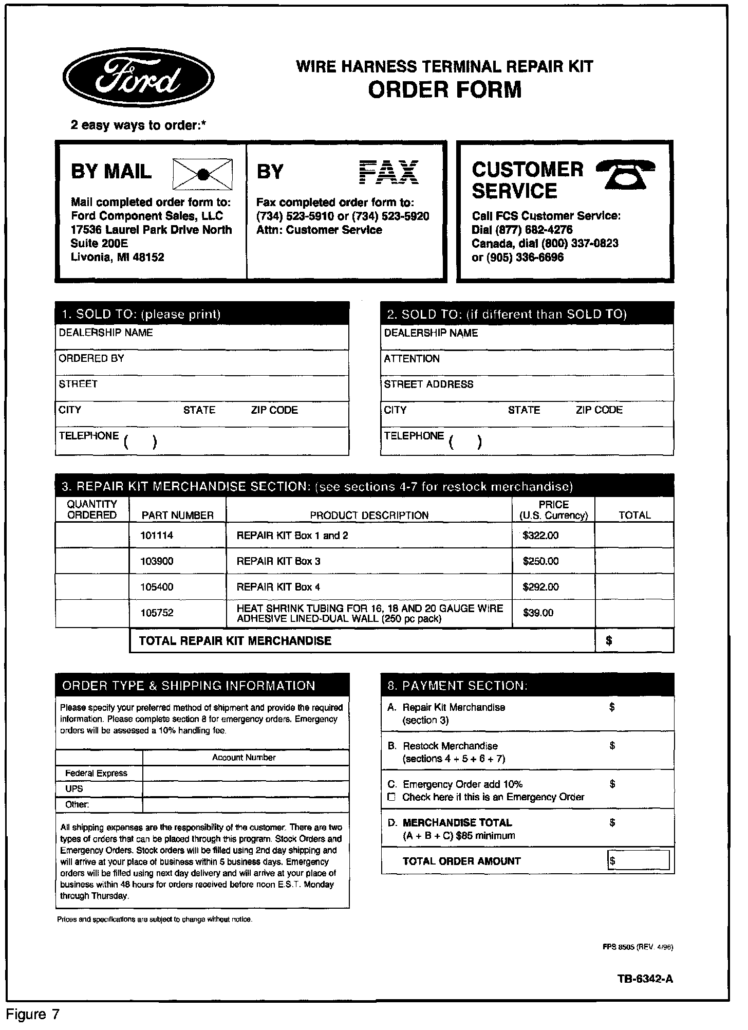 If wiring repairs are required, dealers can obtain a kit by using the included Order Form (Figures 6-11) shown. Pricing information is included for the complete boxes and restocking merchandise for the individual drawers.