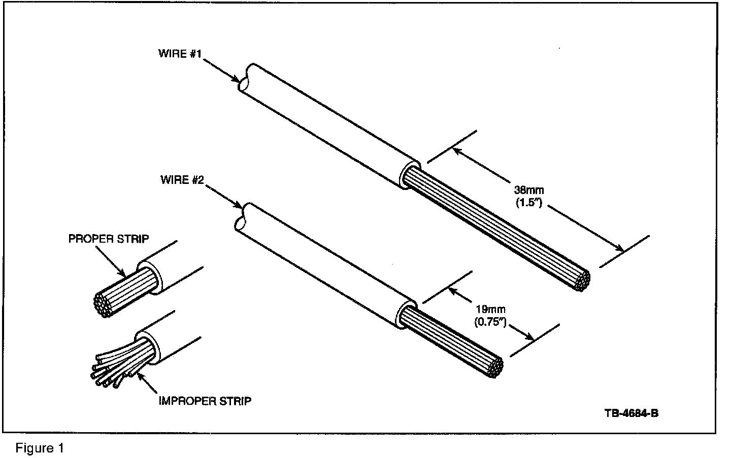 1. Strip 38mm (1.5") of insulation from Wire # 1 and 19mm (0.75 ") of insulation from Wire # 2 (Figure 1). Pull wire straight from stripper. If wire is pulled at an angle, wire strands may be cut off. If more than one (1) strand is cut off during stripping, cut off end and restrip.