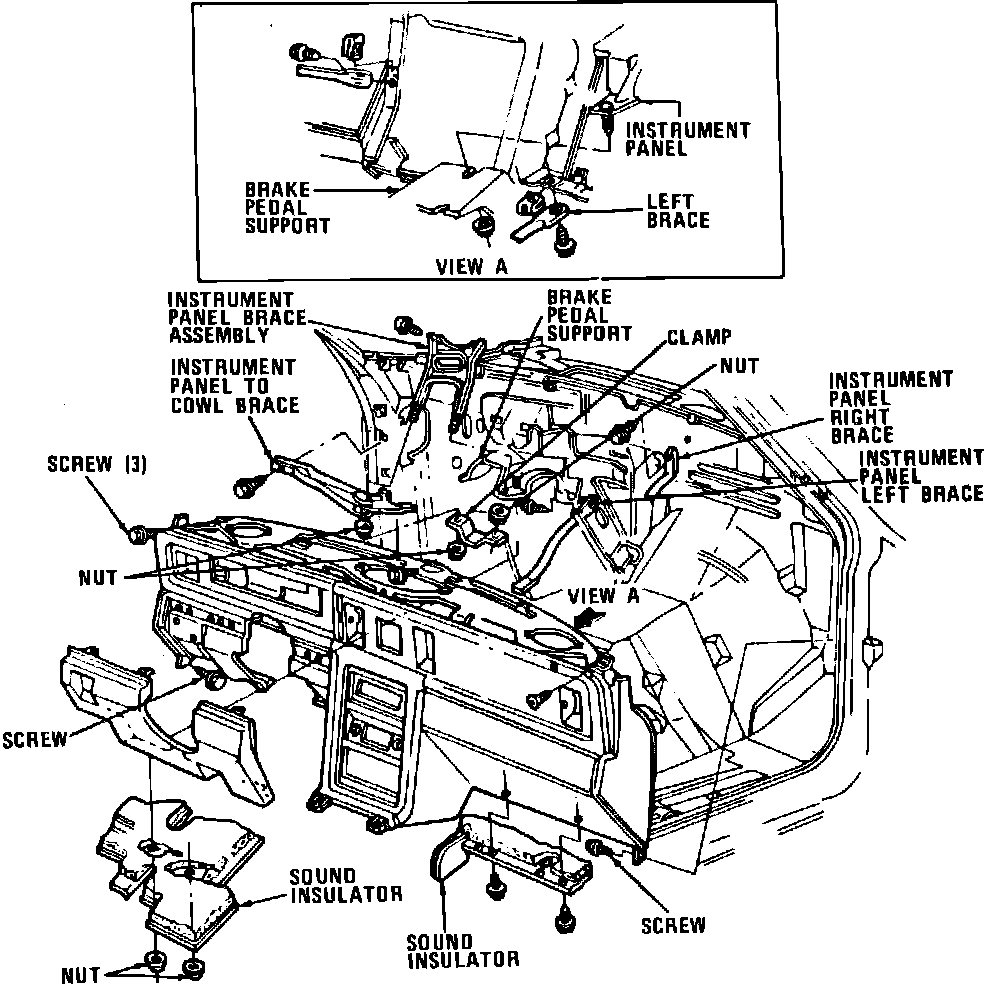 14. Remove instrument panel brace attaching bolt from lower edge of instrument panel on left side of console extension.